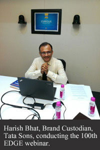 The Tata Best Practices Programme achieved a milestone: it conducted the 100th EDGE webinar for the Tata group on March 29, 2017. Harish Bhat, Brand Custodian, Tata Sons, discussed the concept of ‘The Curious Marketer’, with more than 170 employees from 25 Tata companies attending this centenarian event.